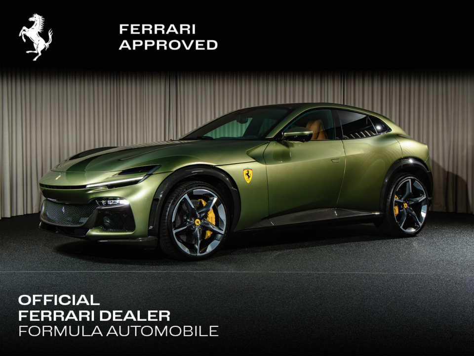 Finished in striking Verde Masoni, this Purosangue makes an unmistakable statement. The cabin is trimmed in elegant Iroko leather, creating a warm and exclusive atmosphere. Airbrushed Scuderia Ferrari shields and black brake callipers enhance its sporting presence.