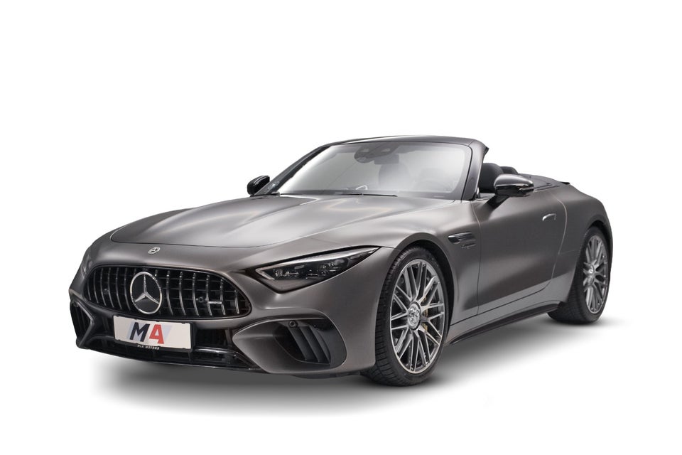 Mercedes-Benz SL63 4,0 AMG Roadster (585 HK) aut. 4Matic+ 2d, i farven Monzagrå magno med sort/antracit kompletlæder kabine.