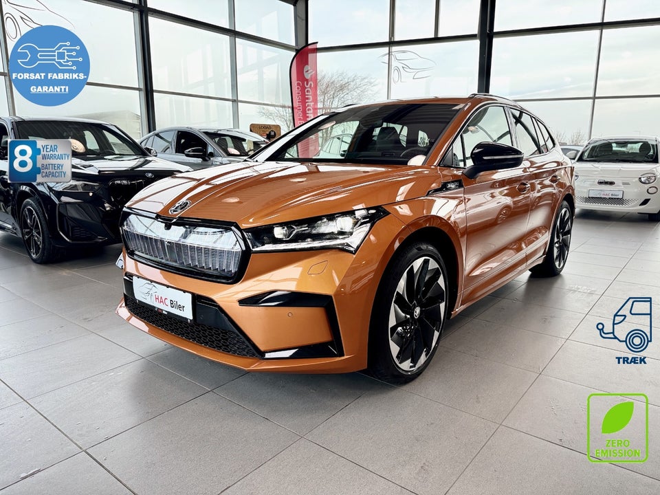 Den elegante Škoda Enyaq kombinerer moderne elbilskraft med sportslige detaljer og luksuskomfort. Her får du en topudstyret model med Sport-interiør, 21” Supernova fælge, Head-up display og masser af avanceret teknologi. En bil der både imponerer i hverdagen og på den lange tur.